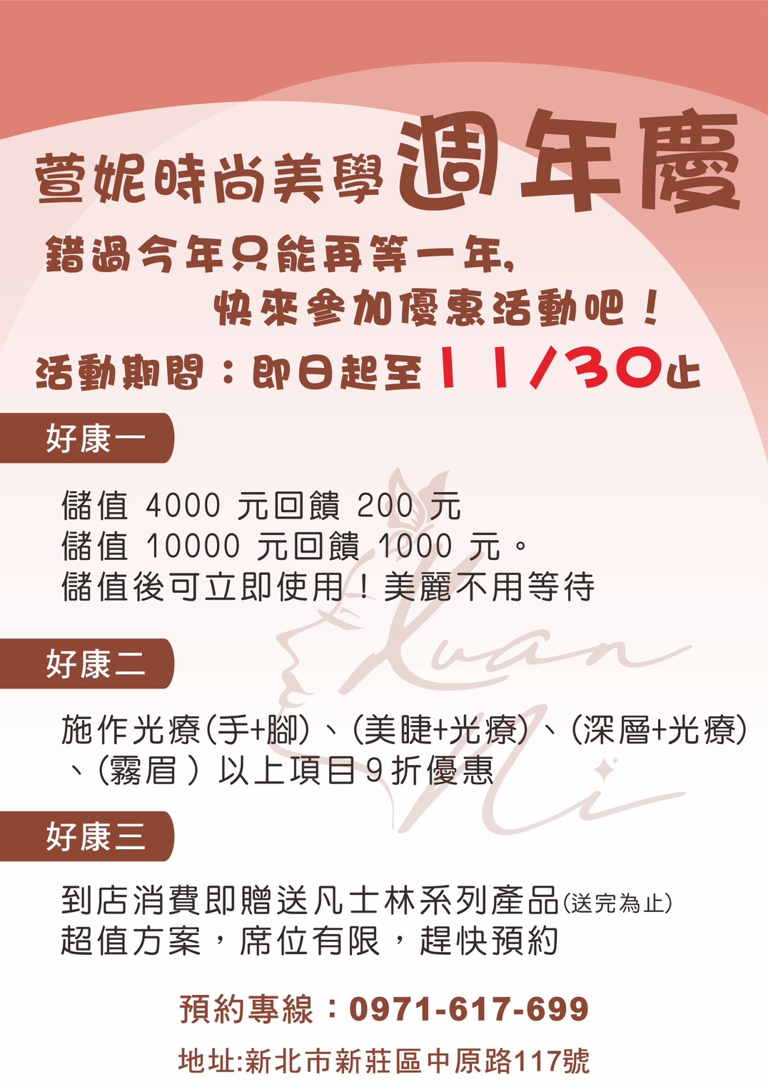 在萱妮時尚美學,我們不僅追求卓越的技術,還注重每位客戶的需求和個性。我們的服務團隊將全心全意為你提供最滿意的美容體驗,讓你感受到尊貴和放鬆。